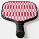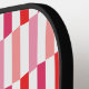 This pickleball paddle has a geometric design of rectangles with diagonal ends in pink and red, repeating throughout the design. If you like the design but prefer different colours, message me.