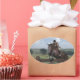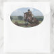 This Oval Sticker features an original digital artwork of a horse and riding jumping over a farm gate, created in Vue by artist Jayne Wilson.