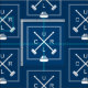 Fabric featuring a pattern of crossed curling brooms in white on blue background. Perfect for curlers and curling fans.