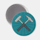 This geologic fridge magnet features a pair of crossed rock hammers on a sunburst background. Below that is a spot for your name or short message in white text.