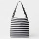 This stylish crossover body bag is shown in a cute black and white stripes print with black straps.
