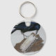 A colour pencil drawing of a curious crow investigating a shiny harmonica adorns this keychain!