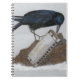 Colour pencil drawing of a curious crow investigating a shiny harmonica he has found.