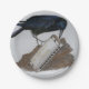 A colour pencil drawing of a curious crow investigating a shiny harmonica he has found adorns these paper plates!