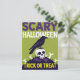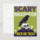 A bold and graphic Halloween postcard featuring a stylized black crow perched atop a white skull and crossbones. The design uses a striking color palette of lime green and dark purple, making the "SCARY HALLOWEEN" and "TRICK OR TREAT" text truly pop. This vertical card is perfect for sending fun, scary seasonal greetings or for giving out to kids as a memorable Halloween treat. Its clean, modern look is highly versatile.