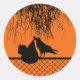 Fun baby shower stickers with a crow holding a baby while on a chain link fence. Trees silhouetted in the background.