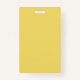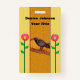 This name or identification badge has a mustard yellow centre with a black crow on a tree branch with two vibrant abstract red flowers on stems with leaves on a light yellow background. Back is light yellow. Customize your name and information with the templates.