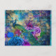 This vibrant design showcases a teal and blue peacock with a gold crown with blue and purple flowers. The background is mostly blue with gold ornate elements and writing.