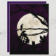 A dark purple sky with full, bright moon and silhouettes of branches, grave stones and crows.
