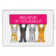 Les chats caricaturaux se tiennent debout sur leurs pattes arrières et tiennent un panneau de couleur cerise qui dit "Crois en toi".