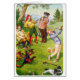 Une illustration vintage d'un groupe de chats sur le terrain de golf, habillé le vêtement de golf, et en ayant la période de leurs vies. Un chat prend une oscillation avec son club de golf, frappant au-dessus du chariot et effrayant outre d'un chien qui va fonctionner de la scène. La carte est intérieur vide pour votre propre message.