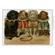 Une illustration vintage de quatre chiens habillés comme clowns avec les colliers hérissés de cou sur tous, et trois d'entre elles chemises de port de clown. Dans l'oeil d'un caractère fané sous les chiens, il y a les "frères nommés Londres de Castell" et "imprimé en Allemagne." Des frères de Castell ont été fondés en 1878 à Londres et ont été également généralement connus comme Pepys. La société a commencé en vendant les articles et les cartes de voeux stationnaires de vacances qu'elles ont appelées "parchemin de Pepys." En 1936, après avoir vu le mouvement "neige blanche et les sept nains" ils ont créé un jeu de société basé sur l'histoire et l'ont vendu sous le nom de Pepys. Suivant cela, leurs affaires principales créaient des jeux de conseil et de carte. La société a été vendue à Gibson en 1983. Cette carte est intérieur vide pour votre propre message.