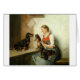 L'illustration vintage par Adolf Eberle dépeint une scène douce avec une femme s'asseyant sur un banc à la maison tenant trois chiots de teckel dans son recouvrement. Le teckel de mère est sur une table à côté de la femme observant son maître tenir ses chiots. La femme tient un chiot sous les jambes avant, avec ses pieds de derrière sur la table, et parle au teckel de mère comme si pour dire, "regarder votre beau bébé !" L'artiste allemand, Adolf Eberle (1843-1914) était né à Munich. Son père, Robert Eberle, était également un peintre. Adolf le plus commun et les sujets préférés étaient des scènes de vie de famille, y compris des chasseurs et des agriculteurs, de la vie rurale bavaroise et tyrolienne. Plusieurs de ces de scènes animaux de compagnie inclus également. Cette carte est intérieur vide pour votre propre message.