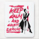 Cruella with her cane standing by large brush stroke words that read: "Keep Calm and Crush Everyone".