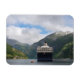 Rectangular souvenir photo magnet of a big cruise ship in the narrow Geirangerfjord with big mountains lining the fjord, seen from the village of Geiranger in Norway.