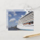 A postcard with a photo of a cruise ship. Send greetings to your family and friends from your cruise adventure! Sideways photo of a big, white cruise ship on the right, sky and fluffy white clouds on the left. Same image is on the back with transparency applied.