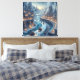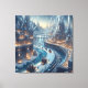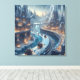 This crystal ice world in a futuristic ice age has delicate crystalline architecture and futuristic sleds travelling through the icy waters of this city on this canvas art piece.