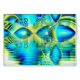 Delightful aqua blue and lime green underwater playground creates a feeling of celebration, heart of love and life. Peacock feathers shine against the crystal. This joyful fractal design is reflected with ripples in the sea. Cosmic ice sculptures and fireworks explode, creating a stunning image of shimmering possibilities. A sense of dreamy illumination is created.