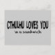 For the fans of H. P. Lovecraft, Cthulhu is an endless source of satirical humour and demented love. Spread your compulsion with this simple message that is a nice mockery of the Jesus blessing "Cthulhu loves you...in a sandwich."