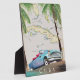 Illustrated map of Cuba (plus surrounding islands) in a beautiful vintage detailed style with a classic old cuban car in the sunset.