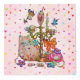 All cute pastel coquette with a tea party setting, tea cups, pastries, candle drum, bird, cat, butterfly, bee, dragonfly, cute things and etc