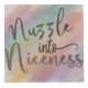 Le design présente le texte "Nuzzle into Niceful" dans une police joueuse, manuscrite, entourée de formes colorées et fantaisistes nuages et étoiles. Le design d'ensemble dégage un sentiment de chaleur, de confort et de positivité, invitant le porteur à embrasser la gentillesse et à trouver de la joie dans des plaisirs simples.