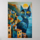 Cubist Blue Cats: Mediterranean Seascape Art Poster