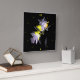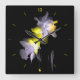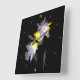 Yellow surreal daffodils sit on a black background over ghostly cubist squares.