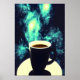 A cup of coffee in a black cup with the space in the background. This is a AI generated art.