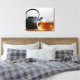 Colour photograph of a clear glass teacup of amber coloured herbal tea next to a black textured metal tea kettle on a table in front of a white wall printed on a 16x20 wrapped canvas. This shot was taken in my Wisconsin studio. A BohippianFinch original photograph.