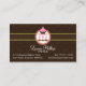 © 2012 Socialite Designs. Whimsical cupcake on a stand and three cake pops inside a lace circle business card design. The background has a chocolate and cocoa damask pattern. A perfect business card for a bakery business or event catering business such as dessert tables. Personalize this bakery business card with your information.