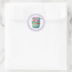 Round sticker is shown with a cute cupcake birthday space mermaid print.
