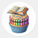 Round sticker is shown with a cute birthday cupcake topped with a books print.