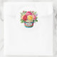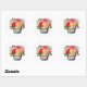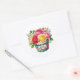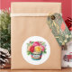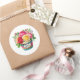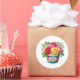 Round sticker is shown with a cute cupcake birthday flowers print.
