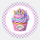 Round sticker is shown with a cute cupcake birthday unicorn print.
