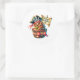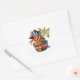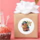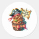 Round sticker is shown with a cute cupcake birthday pirate print.