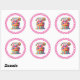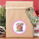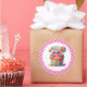 Round sticker is shown with a cute cupcake birthday candy treats print.