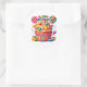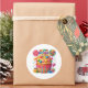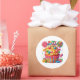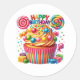 Round sticker is shown with a cute cupcake birthday candy print.