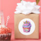 Round sticker is shown with a cute cupcake birthday unicorn print.