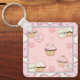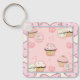 Square key chain with a cute pink frame and background motif with cupcakes and whimsical text:"Life's short. Eat a cupcake!" Replace the background with a photo or your own art graphic if desired.