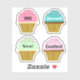 Cupcake shaped stickers with custom words of encouragement for teachers to give deserving students. Four tall frosted cakes with colourful frosting and sprinkles with word templates. Sample text is "excellent", "wow", "nice work" and "100%". Young students love to get special stickers, whether in a public classroom or at home. These come in many sizes with white or transparent options.
