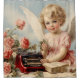 A cute cupid valentine angel write of a typewriter a love letter. A cute Vintage Valentine and wedding motive with pink roses.