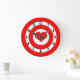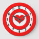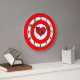 A red and white target with a red heart in place of the bullseye. The black numbers sit in the white circle closest to the edge of this fun wall clock. Cupid is sure to get you right in the heart with this simple, but cute design.