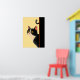 A tuxedo cat peeking around the corner with a curious expression, while a small striped worm playfully appears above. The minimalistic design and warm yellow background enhance the whimsical and lighthearted nature of the scene.