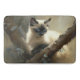 In this painting, a curious Siamese kitten is perched on a tree branch, looking out into the world with bright, inquisitive blue eyes. The kitten's fur is a soft, creamy colour, with delicate brown markings on its face and paws. The background of the painting is soft and ethereal, creating a serene and peaceful atmosphere. The sweet kitten surveys its surroundings with an air of curiosity and adventure. The painting captures a moment of youthful exploration and innocence, as the kitten takes in the beauty of the natural world around it.