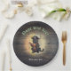 Curious pirate cat deciphers ancient mysteries Round Paper Plate: A black cat dressed as a pirate deciphers an ancient document against a retro sunset.