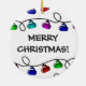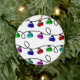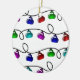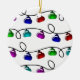 Ornament featuring bright colourful Christmas lights shaped like curling rocks with a customizable message. Perfect holiday gift for curlers and curling fans.
