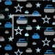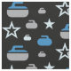 Fabric featuring a stars and curling rocks pattern in shades of blue and grey on black background. Perfect for curlers and curling fans