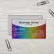 A business card template with a semi-transparent curved header area for the company name and business type etc, with name, job title and other contact details in the section below. The reverse side of the card has been left blank although the base colour is derived using a semi-transparent white image so it matches the semi-transparent header on the front. This can be left blank which is useful for writing notes or can be further customized and/or used for additional text/graphics. This version also has a semi-transparent white texture overlay on both the front and back and a semi-transparent rainbow image on the front which creates the dark rainbow colour variation.