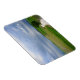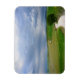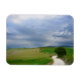 Rectangular souvenir magnet of a winding 'strada bianca' dirt road with many curves through the green fields in a landscape in Tuscany with a tree along the path and beautiful clouds in the sky leading to a destination in the distance. An analogy to reaching your goal.